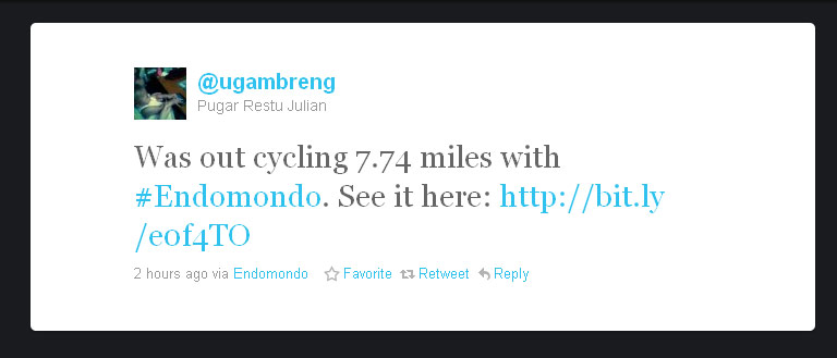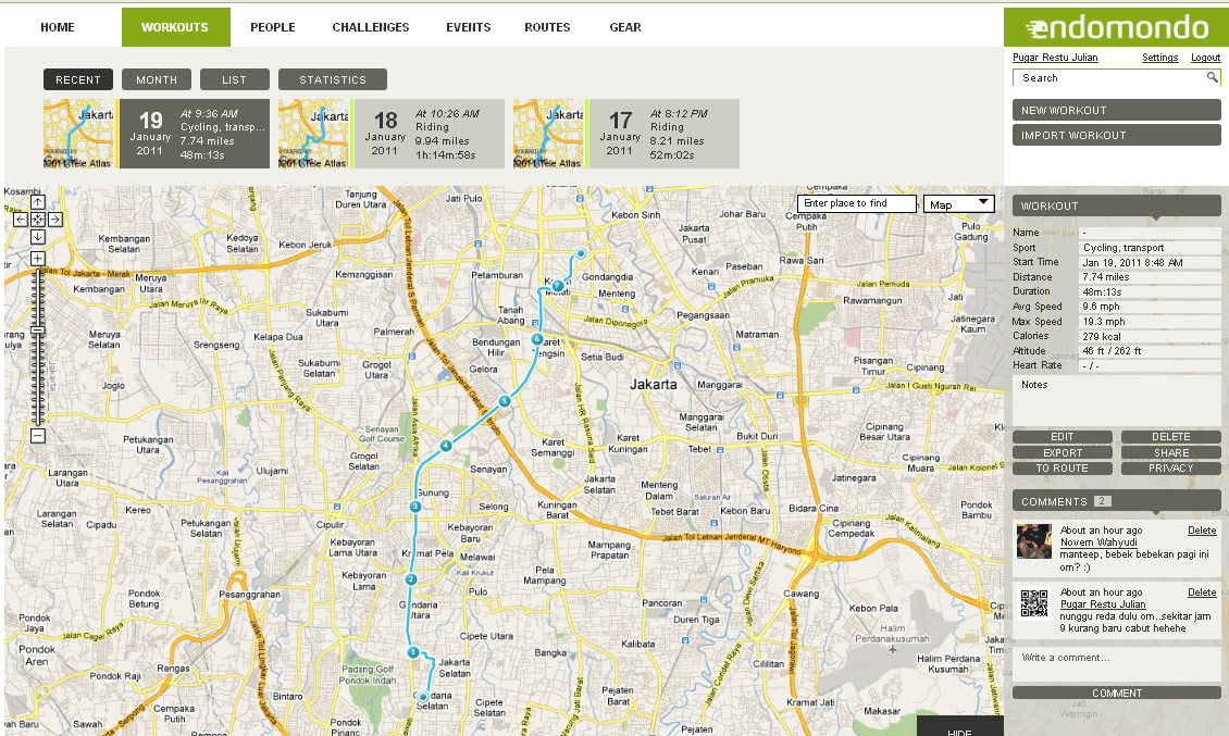 Sekarang, setiap gowes, gue selalu mengaktifkan endomondo gue dulu. asik juga aplikasi ini…jadi endomondo ini bisa ngetrack dengan gps posisi kita, jadi endomondo akan merekam perjalanan kita dari mulai sampai selesai. pun kecepatan kita, dan berapa lama kita berhenti.