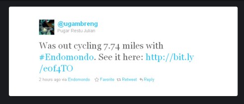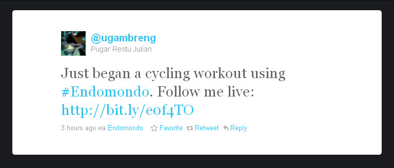 kalau connect ke twitter & facebook, begitu kita start, akan ada notifikasi ke twitter dan facebook, jadi orang lain bisa melihat perjalanan kita dari webnya si endomondo ini.