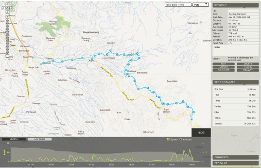 Menurut endomondo, jaraknya sekitar 30-an km, gak tau bener apa gak..takutnya ada waktu dimana GPS gak terdeteksi…